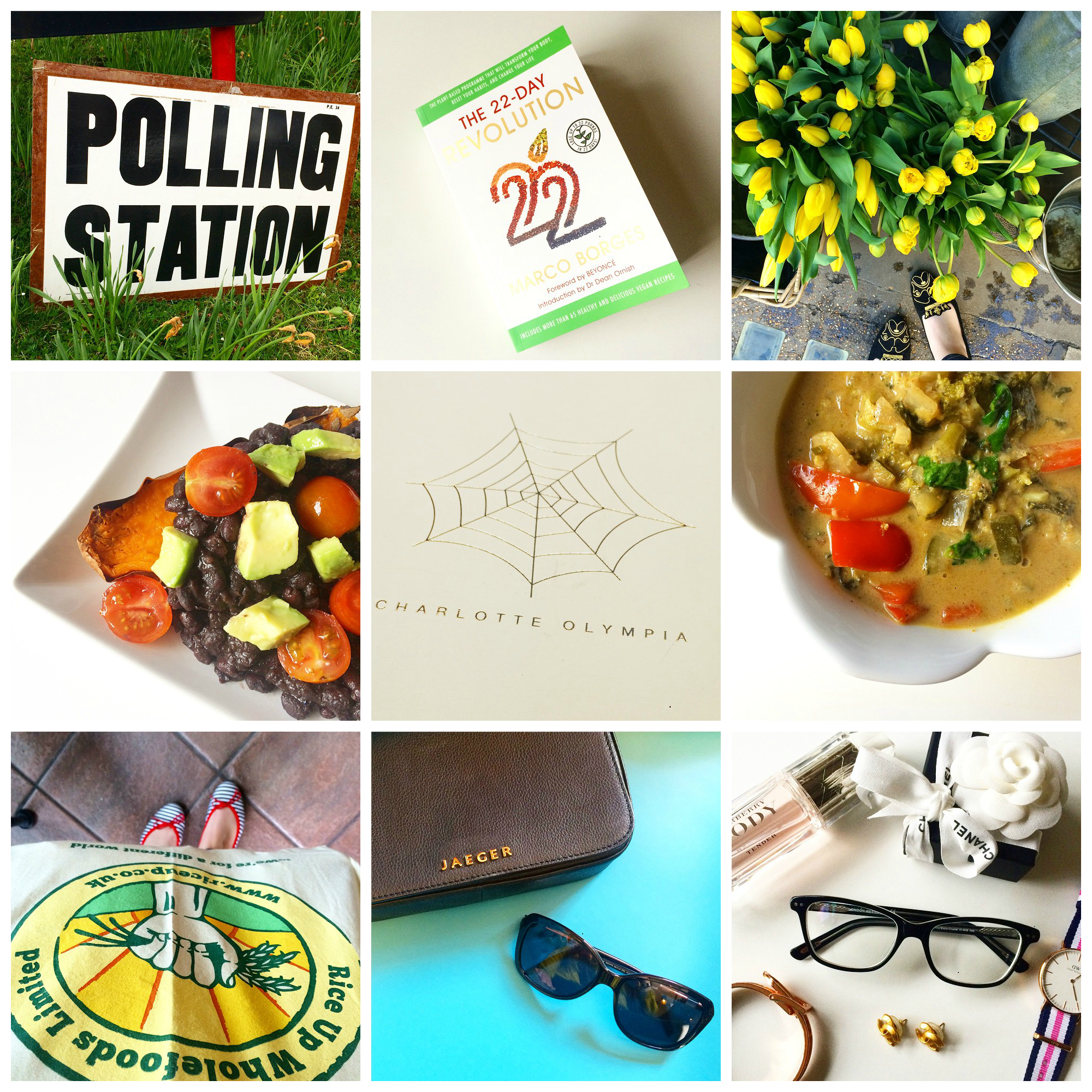 Polling day in the UK / a new start with The 22-Day Revolution / more Liberty London blooms, French Sole King Bulldog flats / Spanish beans over baked sweet potato / much coveted Charlotte Olympia kitty flats – mine at last! / gorgeously simple coconut and veggie curry / a quick trip to Rice Up Wholefoods for some supplies / Jaegar bag and Givenchy shades / London Retro frames, Burberry Body perfume, Daniel Wellington watch, Baublebar bracelet and Chanel earrings